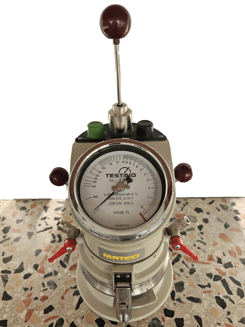 Ai mat përmbajtjen e ajrit në material të freskët. Procedura e provës barazon një vëllim të njohur ajri në dhomën e presionit, me vlerën e panjohur të ajrit të futur në bazën e mbushur me material.